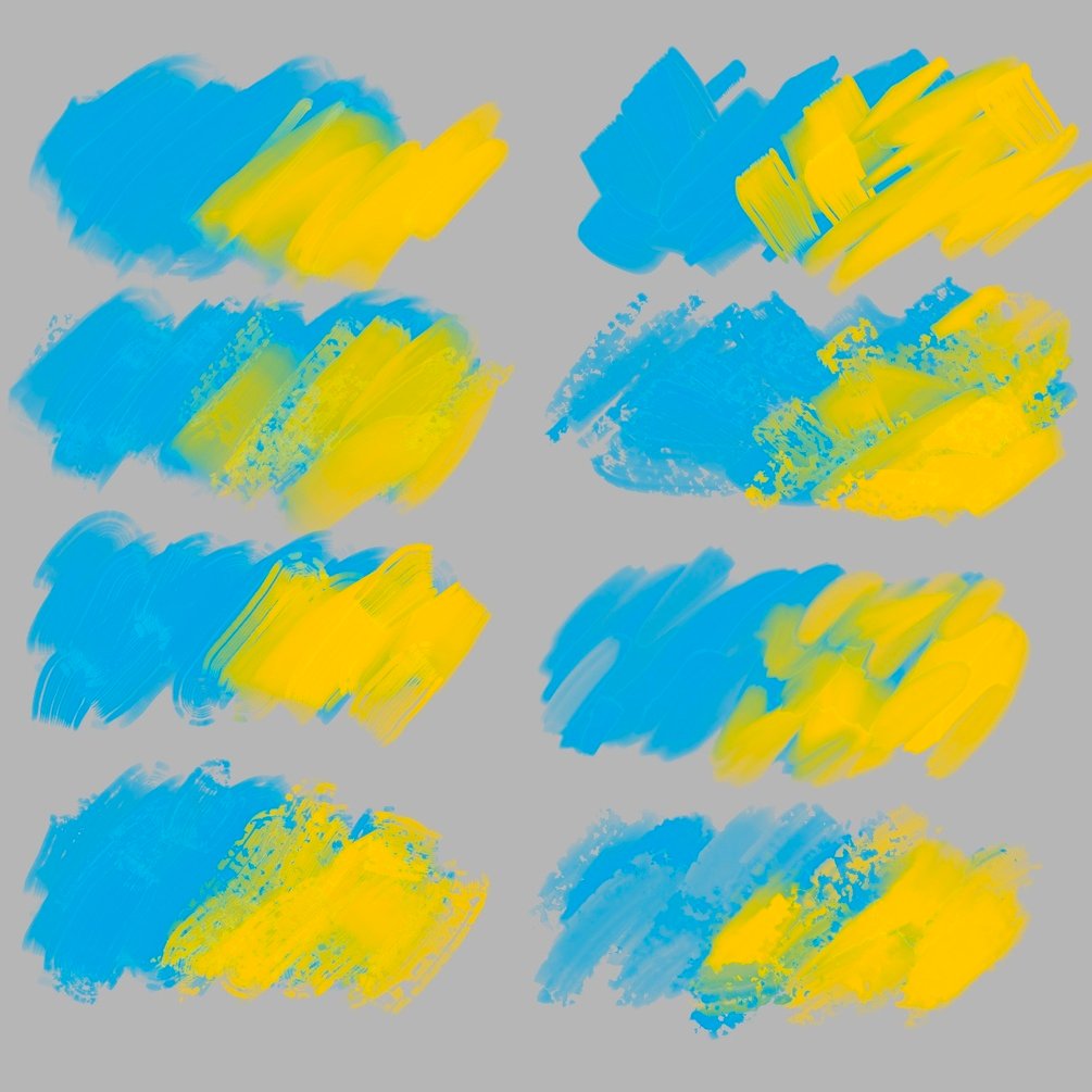 In addition to the 7 basic brushes and 7 textured variations, there are 5 brushes with an "S" in the brush name that emphasize the thickness of the paint.