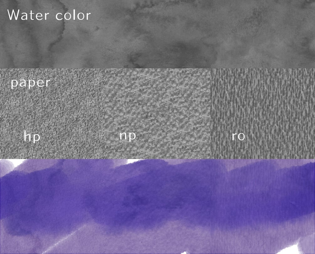 The basic paper grain is H.P.surface, N.P.surface, and Rough, which are the same materials as last time. I created a new texture for the watercolor smudge, but unlike the previous one, it was made by patching together multiple images. In addition, the layer structure has been revised to make it simpler.